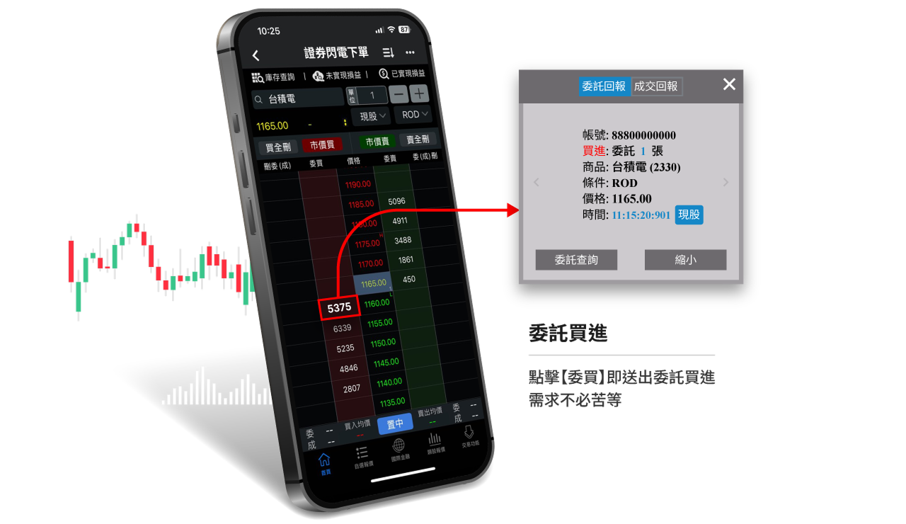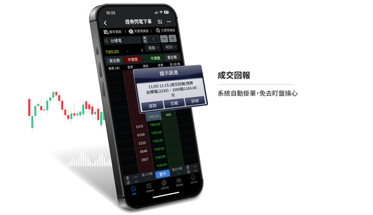 閃電下單可根據用戶自訂策略自動執行委託,並在行情出現變化時迅速反應,協助你縮短思考至出手的時間差,提升實際成交效率。